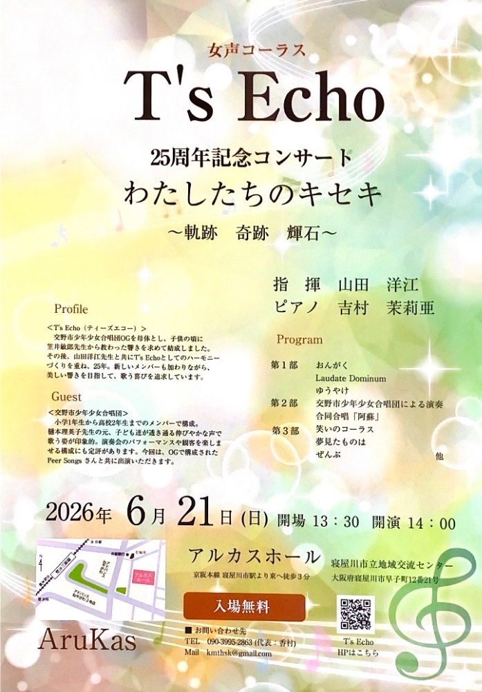 私たちT’s Echo(ティーズエコー) は、交野市少年少女合唱団のOGを母体として結成され、2026年度には25周年コンサートを開催予定です。